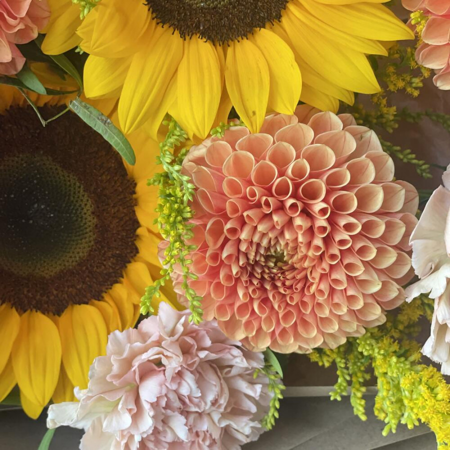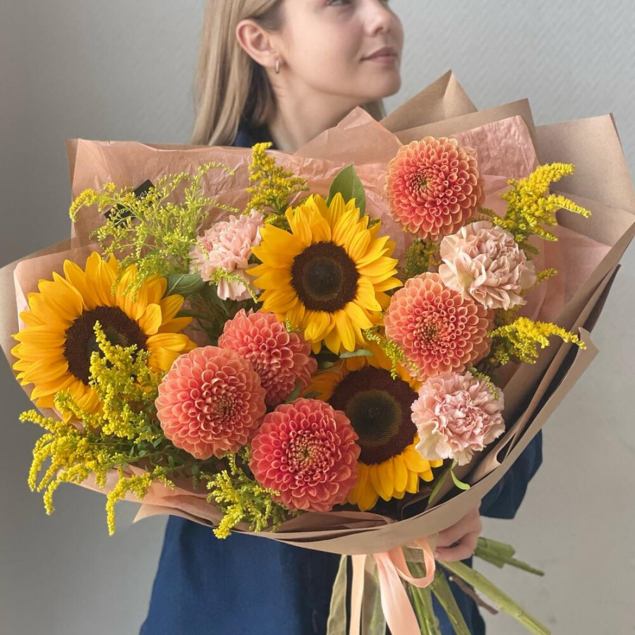На фото букет из подсолнухов и георгин. В составе: георгина 5 шт, подсолнух 3 шт, солидаго 5 шт, гвоздика 3 шт, дизайнерская упаковка 1 шт, атласная лента 1 шт, . Все цветы свежие и ароматные, букет красиво оформлен и отлично подходит для подарка. Доступна доставка цветов или самовывоз.